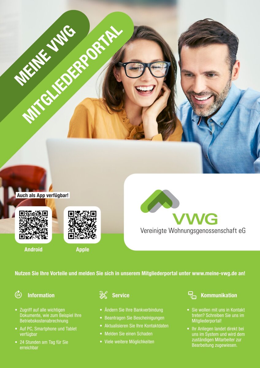 Laden Sie sich einfach unserer App „Meine-VWG“ im Google Play Store oder App Store herunter!